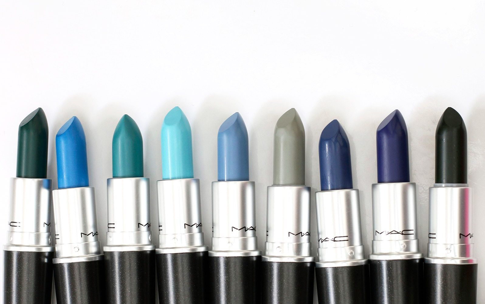 MAC Colour Rocker blue and green shades from the top in Deep With Envy, Blue Bang, Show and Teal, Instant Icon, Jean Genie, Night Mint, Indigo-go, Matte Royal and Mean Green Machine.